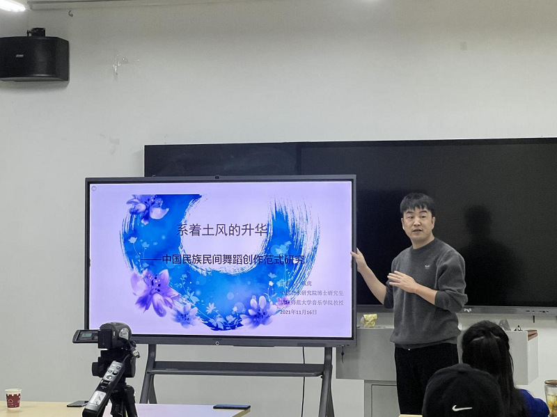 2021年11月30日,中国艺术研究院博士研究生,新疆师范大学音乐学院戴虎教授受邀来华人直播 开展“系着土风的升华——中国民族民间舞蹈创作范式研究”学术讲座。安徽艺术学院教授孙超,云南省民族艺术研究院编辑唐白晶,音乐与影视学院院长熊祖鹏以及舞蹈系全体师生参加此次讲座。