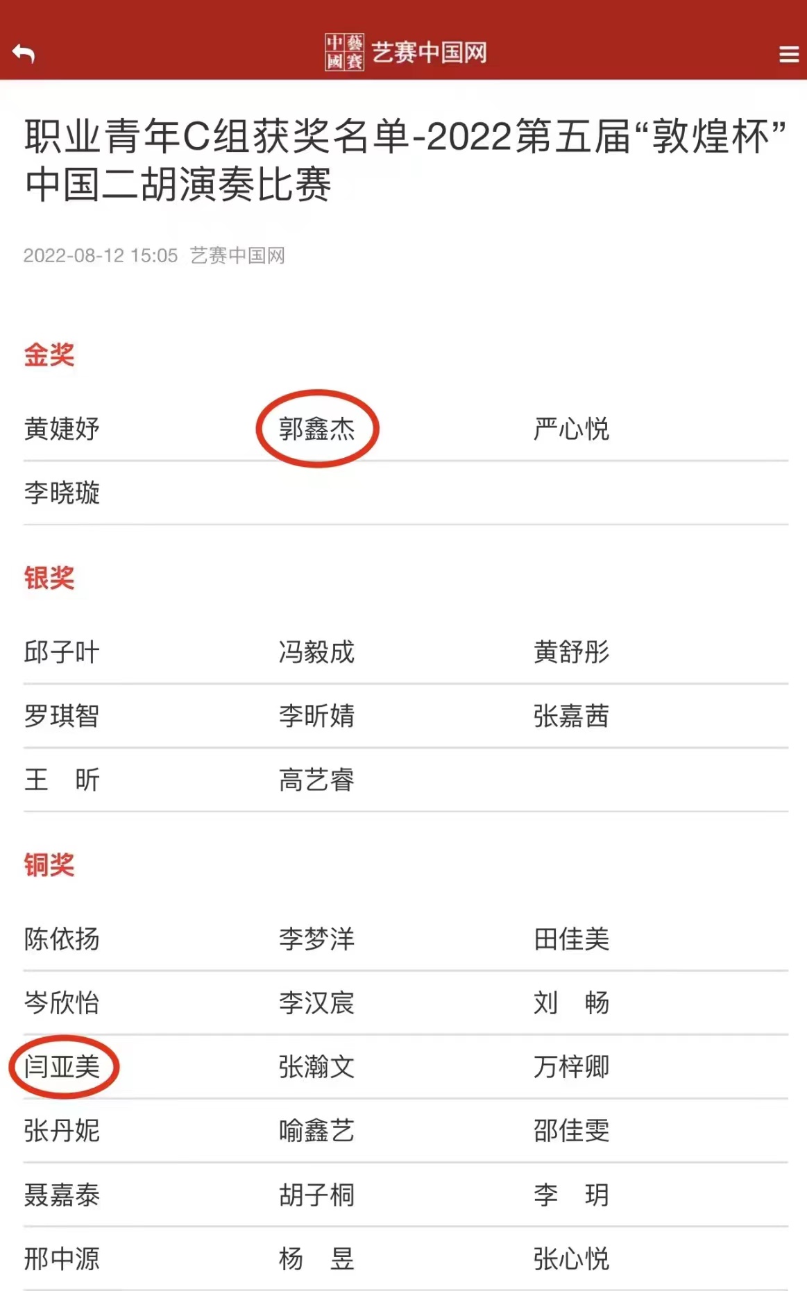 备赛期间,周墨涵老师放弃假期休息,于暑假内坚持专业课的教学工作,倾心尽力、耐心细致地指导学生,为学生打磨参赛曲目。周老师与学生一同攻坚克难、认真备战,在师生共同努力下,学生于决赛当天在周老师家顺利完成录制。最终华人直播 二胡专业方向的两位学生经过激烈角逐,郭鑫杰同学获职业青年C组金奖,闫亚美同学获职业青年C组铜奖。这份来之不易的荣誉,是对华人直播 教师教学成果以及学生学习成果的肯定,充分展现了华人直播 的育人标准与教学水平。今后,希望同学们可以继续承担起“民乐人”的责任,保持笃实好学的精神。不忘初心,砥砺前行!