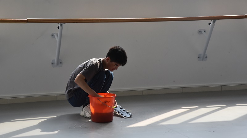 活动前,学院副院长赵一兆鼓励新生强化劳动精神、热爱劳动,通过集体大扫除活动为自己的学习创造更加干净清爽的环境,同时也能收获集体劳动的快乐。大扫除活动在各班班主任和小班的统一带领下,热烈地开展了起来。同学们做好任务分工、撸起袖子就开始了清洁工作:舞蹈班的学生把他们舞蹈房的地板擦得锃亮;表演班热烈地整理起“黑匣子”教室的各类道具;音乐班的同学则齐心协力清扫起各自的理论教室。在同学们的团结协作下,教室更加明亮、劳动精神更加彰显。活动结束后,院长助理何佳莹老师带队对学生劳动成果进行检查,本次新生劳动教育画上圆满句号。
