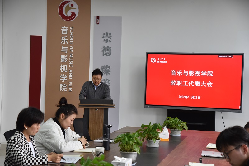 2022年11月23日下午,音乐与影视学院分工会在立行楼442会议室召开2022年教职工代表大会,学院全体教职工参加会议,会议由院党总支书记唐琳主持。