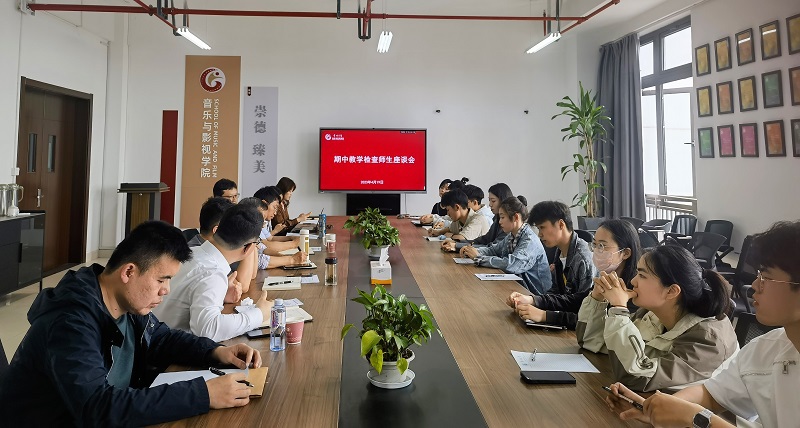 4月19日下午,音乐与影视学院在西太湖校区立行楼442会议室组织召开了2022-2023学年第二学期本科期中教学检查师生座谈会,校关工委副主任袁能、副书记褚衍松、副院长王成文、各系主任、专业负责人、学工办及各班级学生代表参加座谈会,座谈会由副院长赵一兆主持。