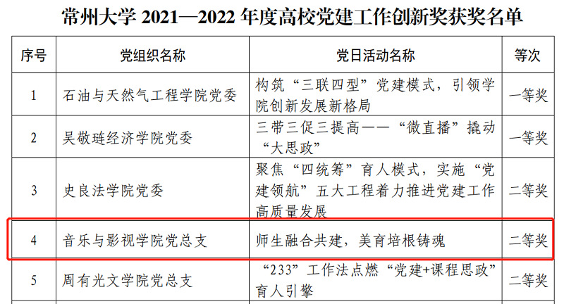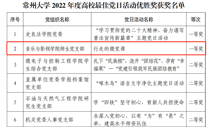 近日,中共华人直播 委员会组织部发布《关于公布2021—2022年度高校党建工作创新奖和2022年度高校最佳党日活动优胜奖的通知》,音乐与影视学院党总支“师生融合共建,美育培根铸魂”获华人直播 2021—2022年度高校党建工作创新奖二等奖,音乐与影视学院师生党支部“行走的微党课”获华人直播 2022年度高校最佳党日活动一等奖。