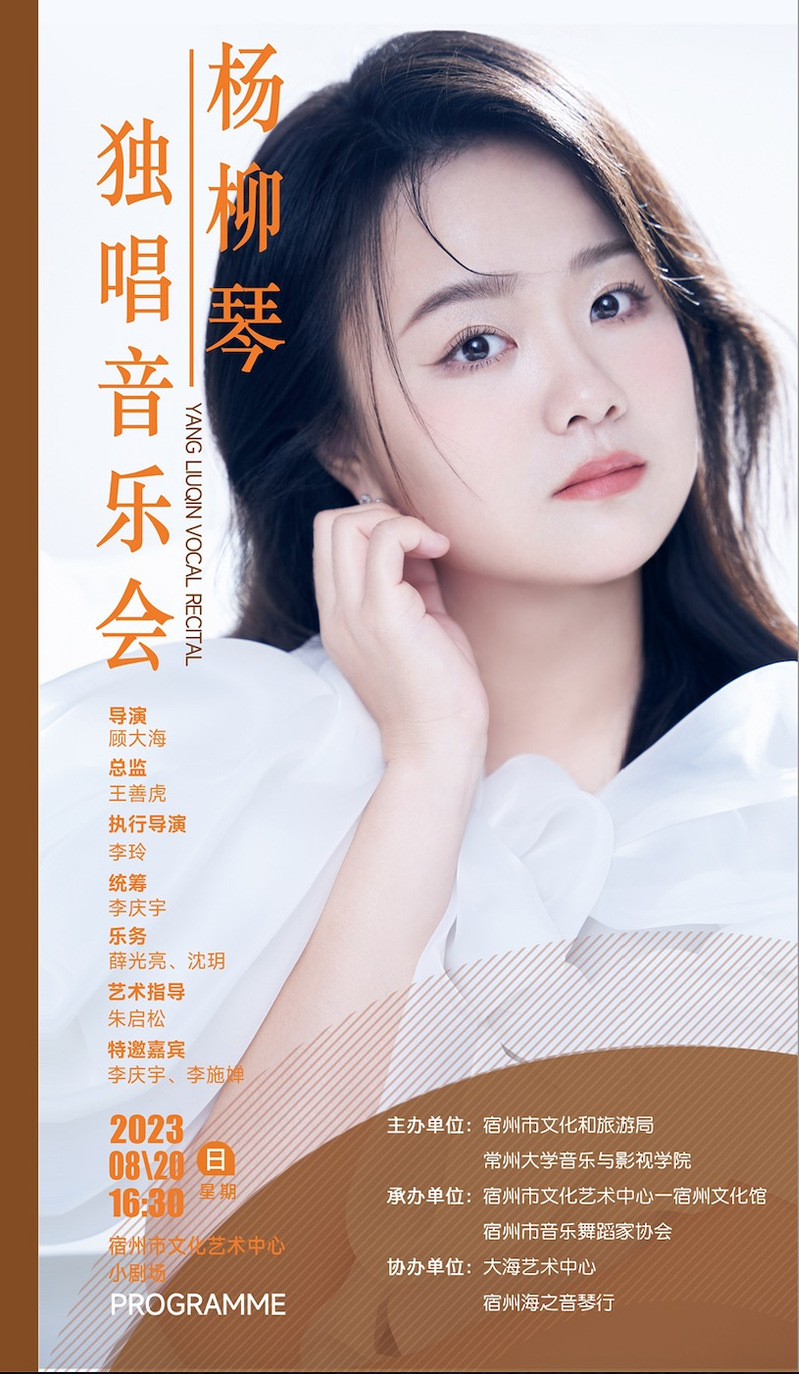 2023年8月20日下午,由宿州市文化和旅游局、宿州市文学艺术届联合会、华人直播 音乐与影视学院主办,宿州市文化艺术中心-宿州市文化馆、宿州市音乐舞蹈家协会承办的杨柳琴独唱音乐会在宿州市文化艺术中心小剧场如期举办。宿州市文联副主席徐宁,宿州学院音乐学院院长、宿州市音乐舞蹈家协会主席王善虎,宿州市文化艺术中心主任李小兵,宿州市文化馆馆长李玲,阜阳师范大学侯方教授,胡以芳副教授,宿州学院顾大海副教授等300余名师生、市民观看了本次音乐会。