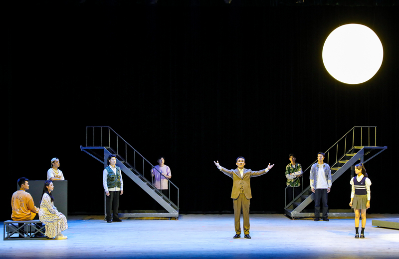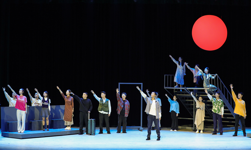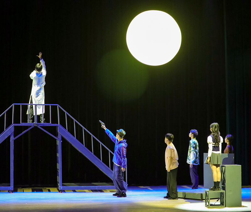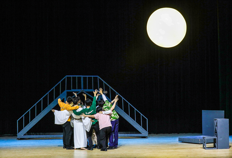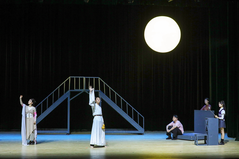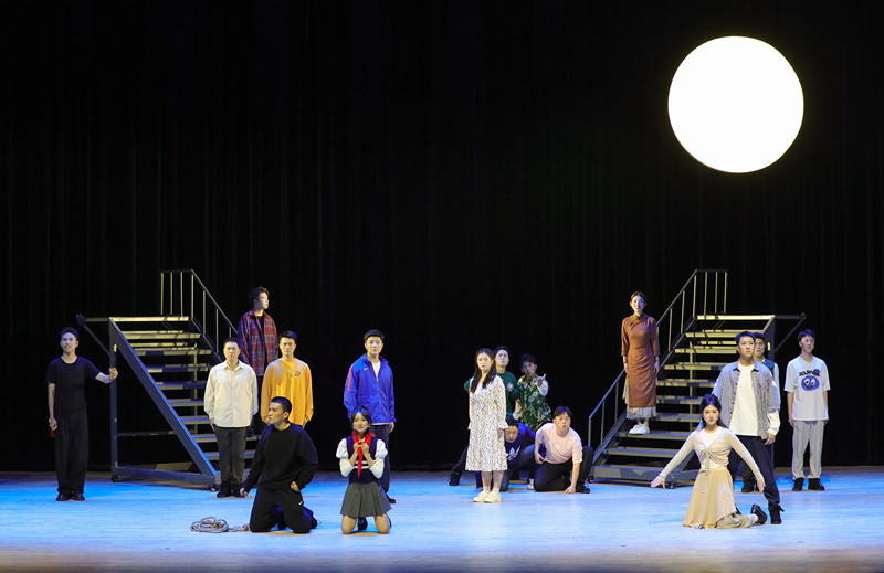 原创诗话剧《月亮与烟火》由国家一级演员、音乐与影视学院表演专业负责人蔡伟教授担任艺术总监,表演系主任童劲杰、青年教师陈思含执导,著名诗人欧震编剧。该剧从表演系学生的视角出发,以戏剧排练为剧情主线,通过戏中戏的方式,呈现出当代大学生丰富多彩的校园生活,表达了新时代青年对历史的追忆和对国家的热忱。剧中学生扮演的瞿秋白、刘半农等人物形象,激励着当代青年铭记历史、砥砺前行;运河母亲则展现了常州地域文化,寄托着对乡土的眷恋和对祖国的深情;而李白、嫦娥、云、鸟等角色则是浪漫主义的化身,以富有诗意的台词引发观众的无限遐想,为全剧增添一抹亮丽的色彩。舞台上,表演专业学生展现出成熟的表演技巧与昂扬向上的青春活力,精彩的演出获得在场观众一致好评。