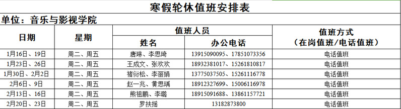 音乐与影视学院寒假轮休值班安排