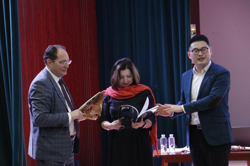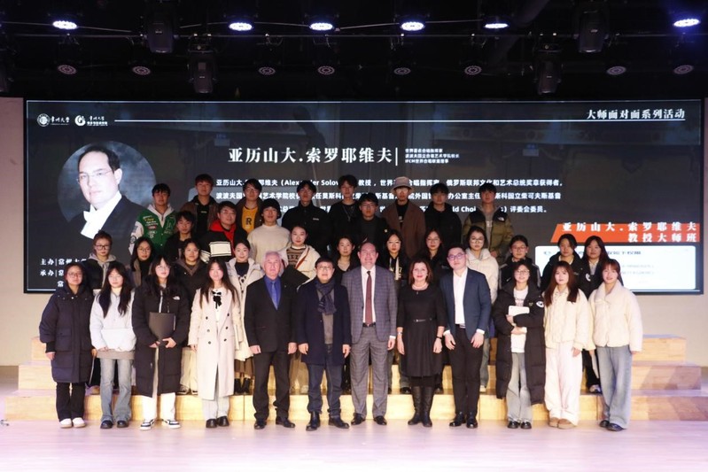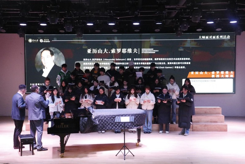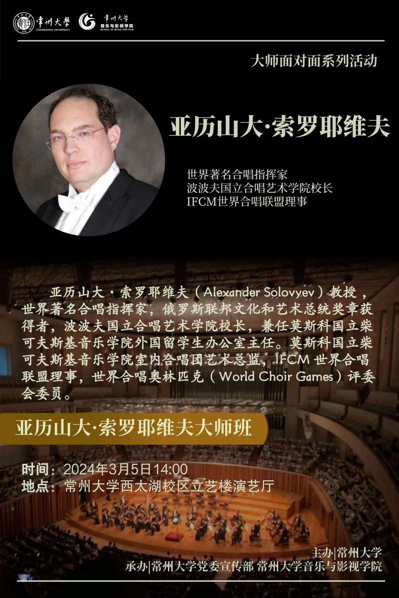 3月5日下午,亚历山大·索罗耶维夫教授在西太湖校区立艺楼演艺厅为常大师生带来了精彩绝伦的大师课,他首先介绍了世界音乐史上具有影响力的合唱家、指挥家、作曲家、演奏家以及俄罗斯当代各类重要的音乐节和赛事流程,并视频展示了他指挥演出的多场音乐会,随后他向华人直播 特聘外籍专家欧丽佳·波利亚科娃教授赠送了自己汇编出版的作曲合辑,最后他向在场声乐系学生传授了莫斯科音乐学院呼吸练声的方法,并对华人直播 龙吟合唱团进行了详细的合唱实践指导,让在场师生受益良多。
