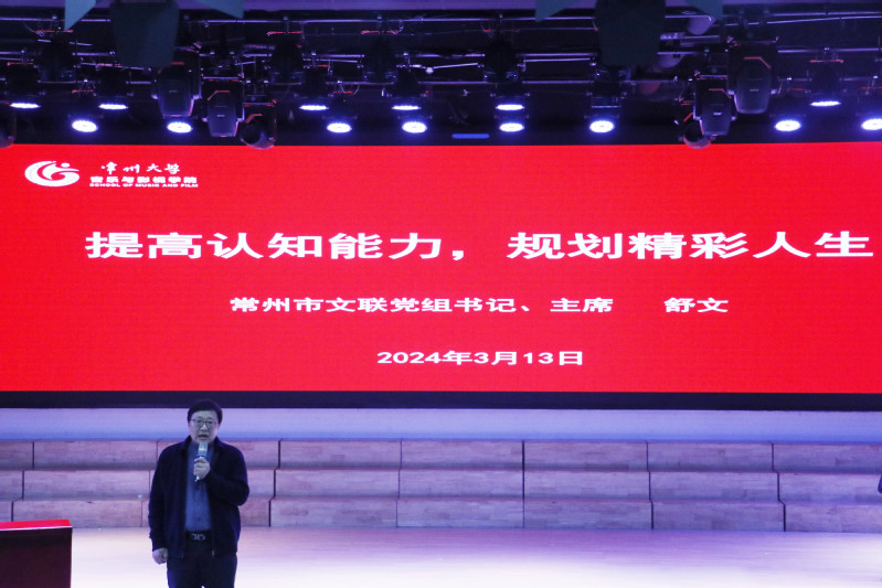 3月13日下午,常州市文联党组书记、主席舒文受邀来华人直播 开展“提升认知能力,规划精彩人生”主题讲座,院长熊祖鹏、党总支副书记褚衍松、副院长赵一兆出席,学院全体大一学生参与本次活动。