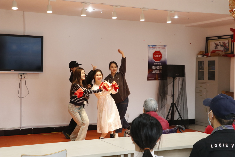 春日温暖,桃花盛开,一曲欢快的《桃花朵朵开》拉开了演出的序幕。同学们或唱或跳,或演或颂,为场下的老人们先后表演了《萱草花》《赛马》《相亲相爱》《热闹的一场年梦》《东北秧歌》等节目,歌声婉转悠扬,舞步欢快轻盈,朗诵铿锵有力,表演张弛有度,演出现场热闹非凡,在场的老人们脸上洋溢着开心的笑容,演出现场暖意融融、掌声轰鸣。