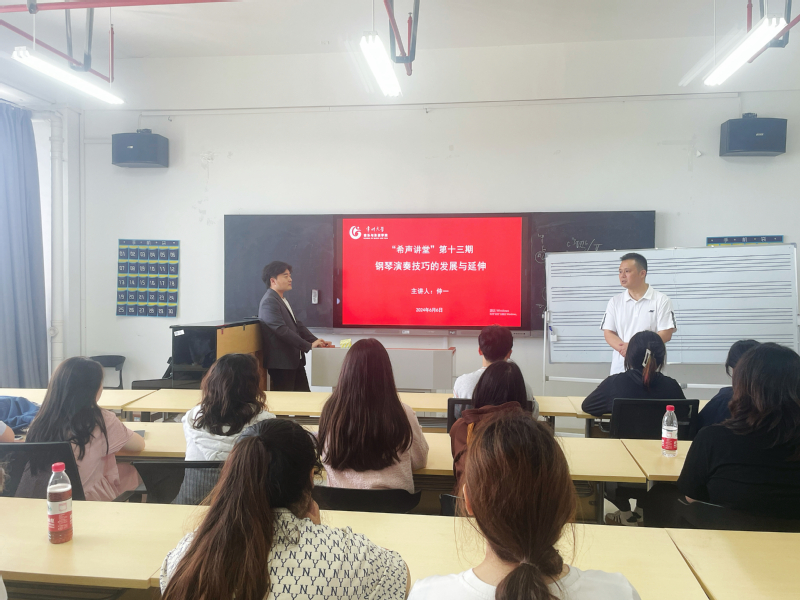 6月6日下午,音乐与影视学院在立行楼427教室举办“希声讲堂”第十三期讲座,讲座由副院长王成文主持,学院钢琴专业教师和钢琴主项、音乐教育专业学生参加讲座。
