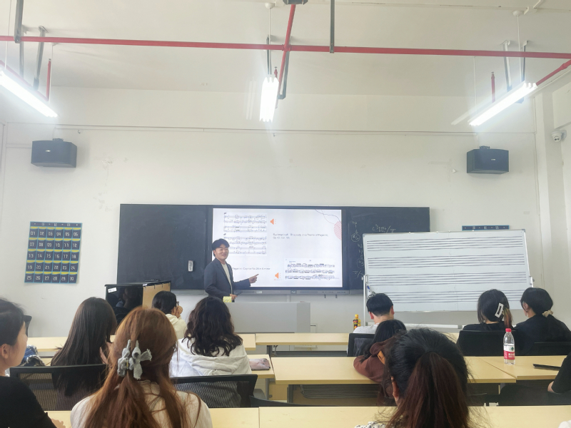 此次讲座主讲人仲一,施坦威青年艺术家,Starsing Classic签约青年钢琴家,旅英音乐博士,华人直播 音乐与影视学院院长助理、钢琴艺术研究中心主任、钢琴系副教授、硕士生导师。讲座中,仲一首先从历史的角度出发,梳理了键盘乐器的发展历程,为学生展示了许多新颖的现代钢琴音乐作品。他强调随着音乐教育的普及和演奏水平的提高,现代钢琴演奏技巧正朝着多元化、个性化的方向发展。通过现场演示和讲解,向师生们展示了现代钢琴演奏中一些独特的技巧和方法,让在场的师生们对现代钢琴音乐的演奏技巧有了更为直观的了解。