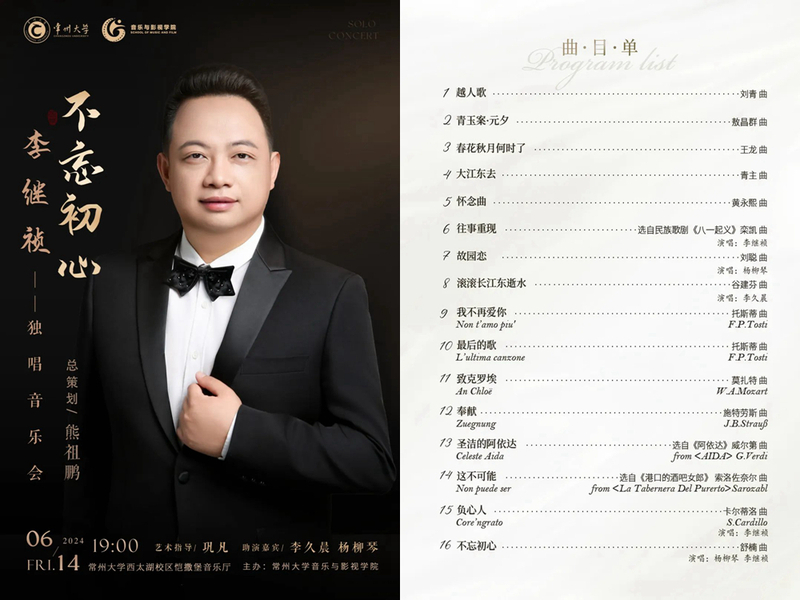 614日晚,李继祯“不忘初心”独唱音乐会在西太湖校区礼堂举行。常州工程职业技术学院副校长张雪华、浙江音乐学院声系副教授叶勇、常州市总工会基础部部长王一博、常州市文化宫副主任景晓黎,华人直播 关工委副主任袁能、音乐学院领导班子、师生代表以及李继祯的家人和朋友共同出席此次音乐会。