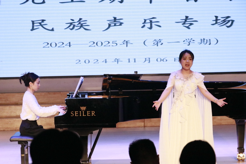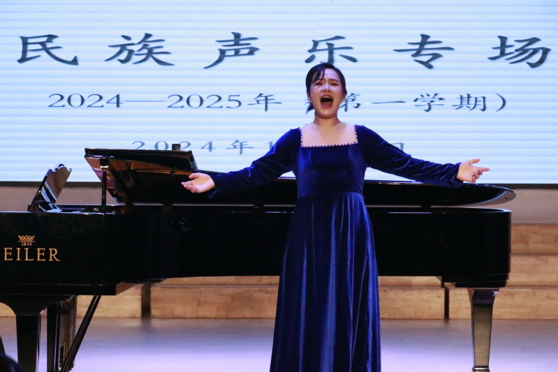 2024年11月6日,音乐与影视学院在立艺楼演艺厅隆重举行了艺术硕士(音乐)期中音乐会民族声乐专场。这场音乐会汇聚了9位民族声乐表演的研究生,他们以精湛的技艺和深厚的情感,演绎了27首风格多样的民族声乐作品,如《歌》、《运河谣》、《天边有颗闪亮的星》、《秦生啊你还好吗》、《哥哥不来花不开》、《洪湖水浪打浪》、《踏雪寻梅》等,这些作品既有传统的经典,也有现代的创新之作,展现了民族声乐的丰富内涵和独特魅力。