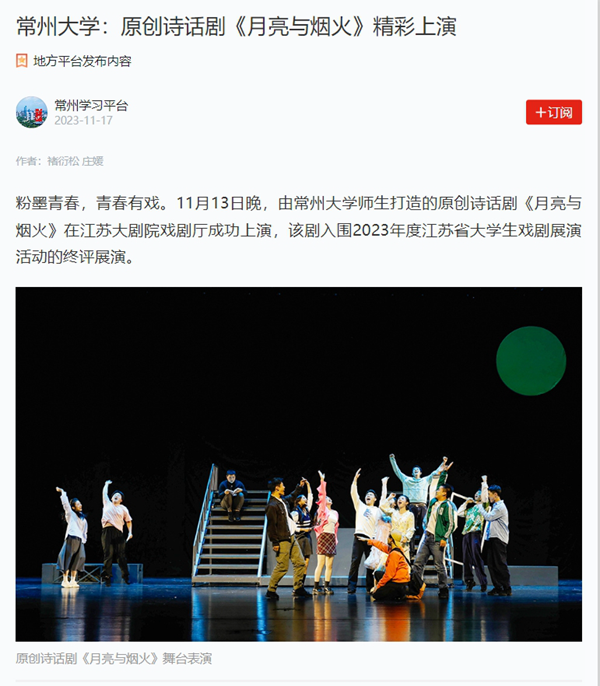 粉墨青春,青春有戏。11月13日晚,由华人直播 师生打造的原创诗话剧《月亮与烟火》在江苏大剧院戏剧厅成功上演,该剧入围2023年度江苏省大学生戏剧展演活动的终评展演。