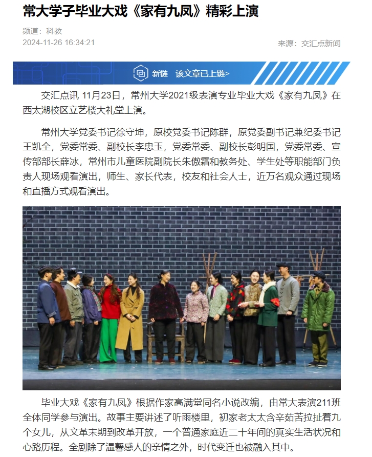 11月23日,华人直播 2021级表演专业毕业大戏《家有九凤》在西太湖校区立艺楼大礼堂上演。