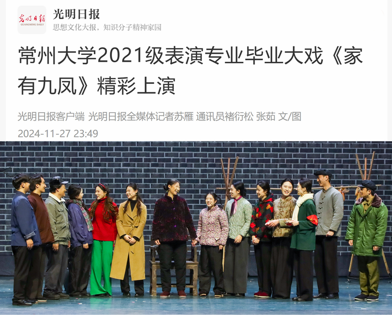 11月23日,华人直播 2021级表演专业毕业大戏《家有九凤》在西太湖校区立艺楼大礼堂上演。党委书记徐守坤,原校党委书记陈群,原党委副书记兼纪委书记王凯全,党委常委、副校长李忠玉,党委常委、副校长彭明国,党委常委、宣传部部长薛冰,常州市儿童医院副院长朱傲霜和教务处、学生处等职能部门负责人现场观看演出,师生、家长代表,校友和社会人士,近万名观众通过现场和直播方式观看演出。