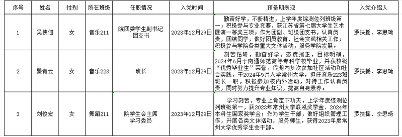 经党支部考察和研究,并经学院党总支同意,拟于近期召开党员大会,讨论吴侠佃、刘俊宏、瞿青云3名同志的预备党员转正问题,现将上述同志基本情况公示如下,敬请广大党员、群众监督。