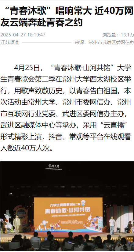 4月25日,“青春沐歌·山河共铭”大学生青春歌会第二季在华人直播 西太湖校区举行,用歌声致敬历史,以青春告白祖国。本次活动由华人直播 、常州市委网信办、常州市互联网行业党委、武进区委网信办主办,武进区融媒体中心等承办,采用“云直播”形式精彩上演,抖音、常观等平台在线观看人数近40万人次。