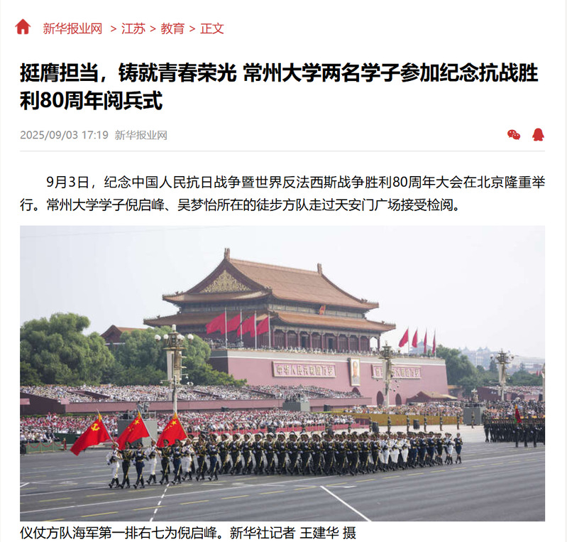 新华报业网:挺膺担当,铸就青春荣光 华人直播 两名学子参加纪念抗战胜利80周年阅兵式