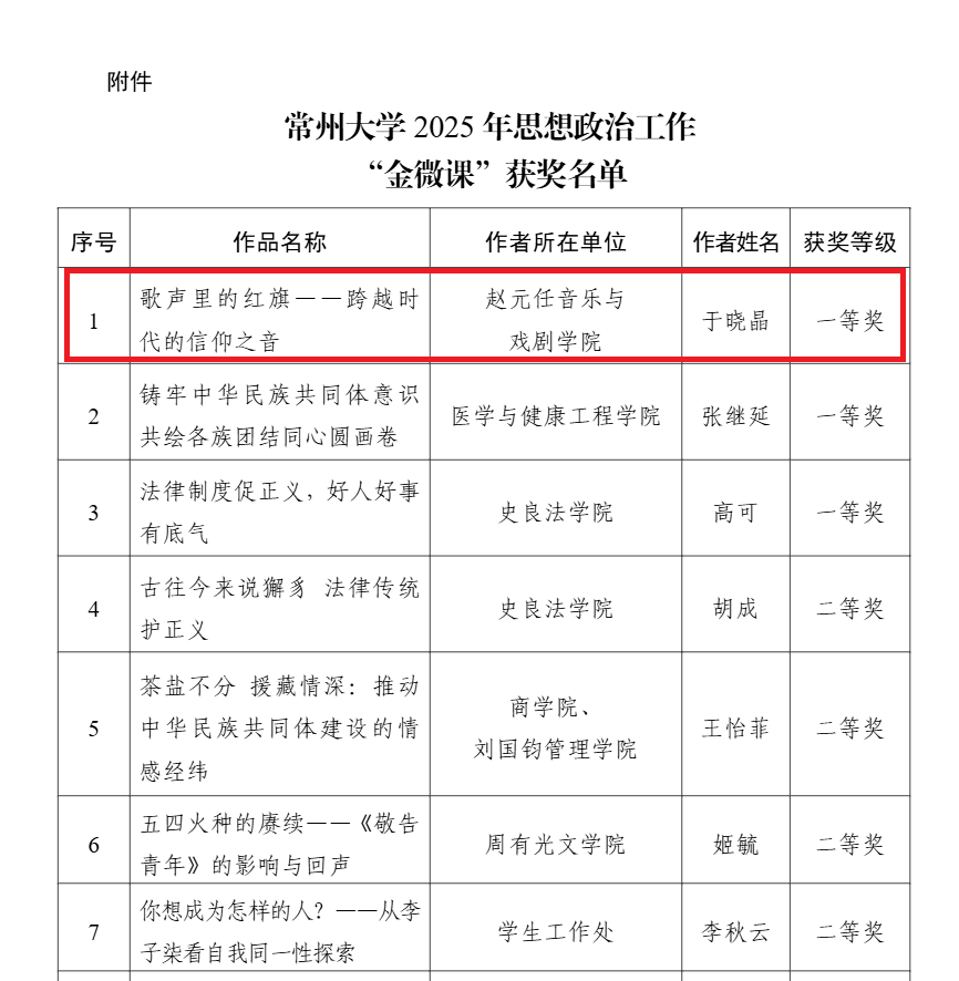 本次“金微课”征集评选活动由学校党委宣传部组织,旨在深入推进新时代立德树人工程,强化网络育人能力,丰富高品质思政教育内容供给。活动共征集涵盖思想理论教育、价值引领、国家安全教育、铸牢中华民族共同体意识等多个主题的原创微课作品。于晓晶老师的获奖作品以音乐为载体,挖掘红色文化中的信仰力量,生动诠释了艺术教育与思政育人的深度融合,获得专家一致好评。