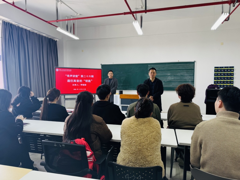 3月27日下午,“希声讲堂”第二十六期在立行楼429教室顺利开讲。讲座由学院声乐教师李继祯主讲,主题为《通往高音的“钥匙”》,学院声乐专业学生及教师共同参加学习。