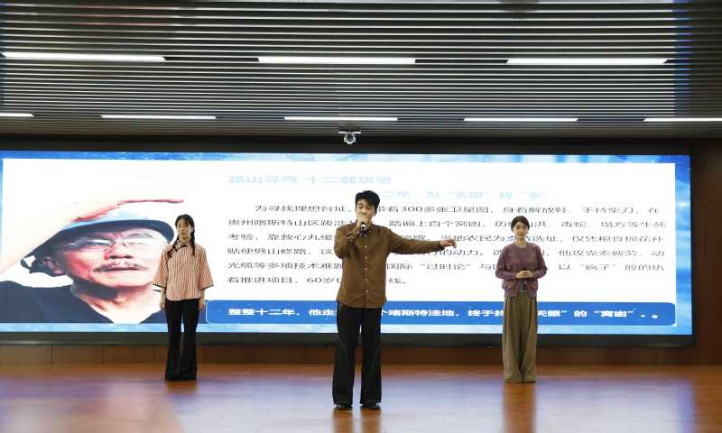启动仪式上,华人直播 表演241班屠心语、王靖仪、吕小龙、牛婉婷带来的第十五届读书节优秀作品——朗诵表演《以星光火炬,赴时代之约》,讲述黄令仪、南仁东、何泽慧等科学家攻坚克难的感人事迹,激励青年勇担使命、逐梦前行。